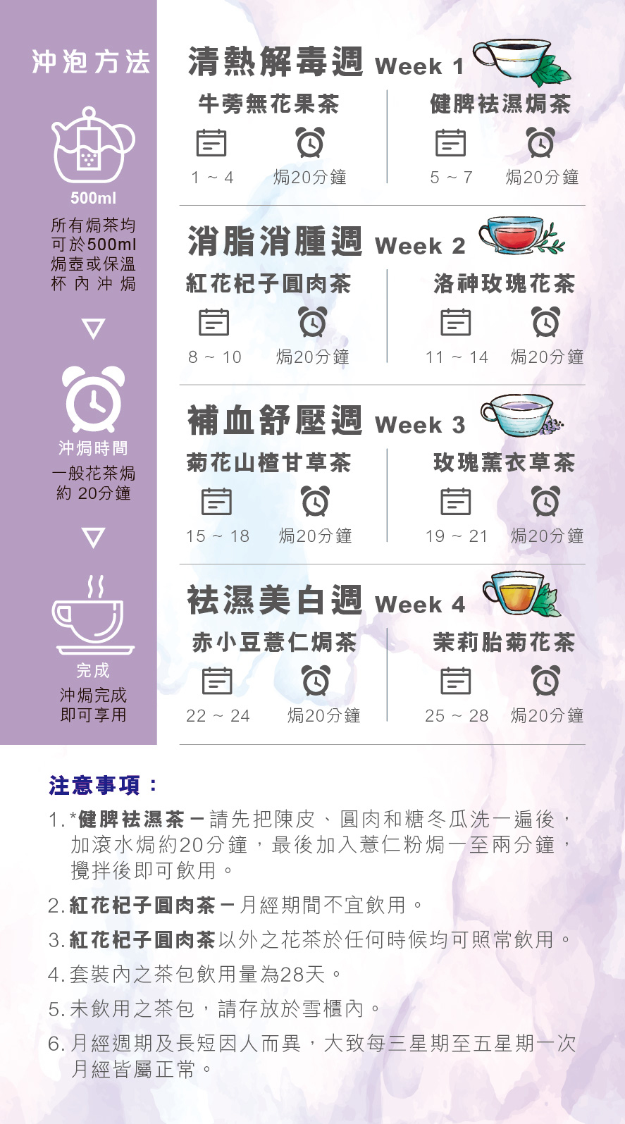 「28天消脂焗茶套裝」是針對女性28天的生理周期而設計,按著順序每天焗一杯茶,連續飲三個月經周期,便可協助調理,排毒祛濕,定神舒壓,幫助身體順應生理期的變化,務求令再忙的大家也可以輕鬆地用最天然的方式照顧自己,和月經和平共處。
