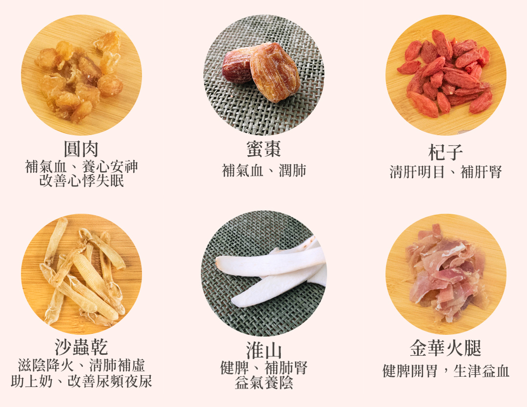 成份:沙蟲乾、淮山、圓肉、杞子、蜜棗、金華火腿