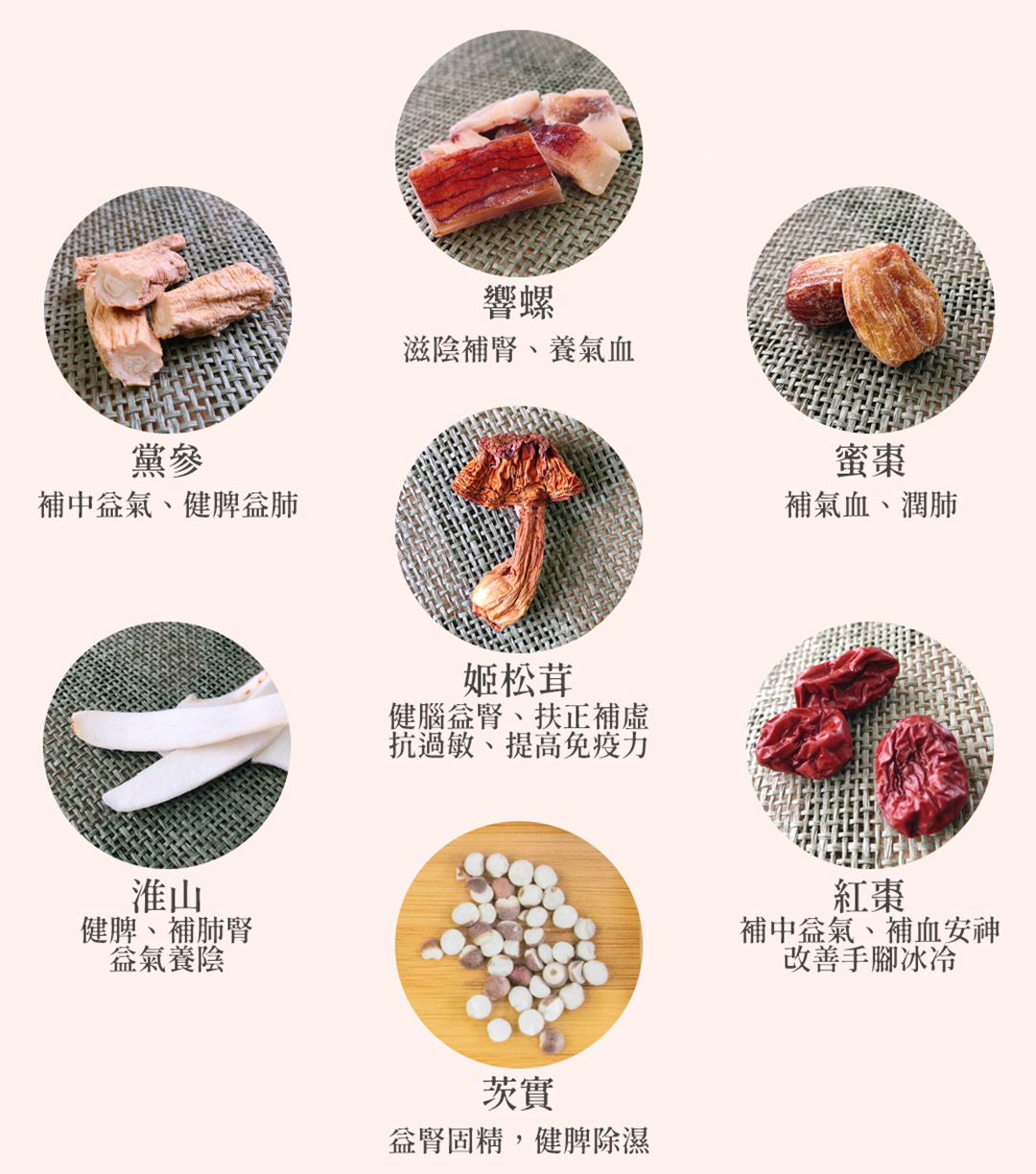 成份:姬松茸、淮山、螺片、黨參、茨實、紅棗、蜜棗