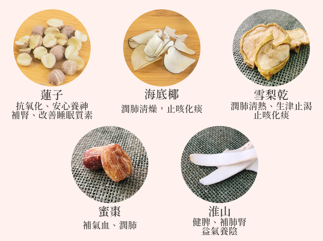 成份:海底椰、雪梨乾、淮山、蓮子、蜜棗