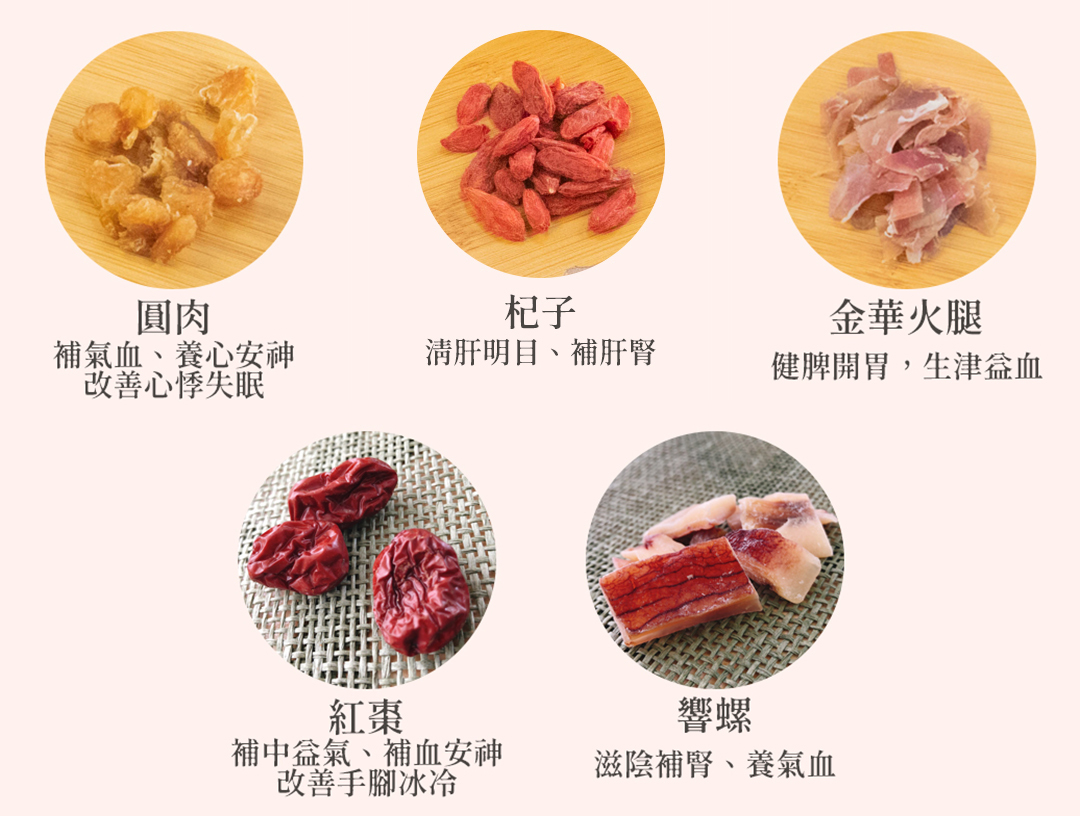 成份:螺頭、圓肉、杞子、紅棗、金華火腿