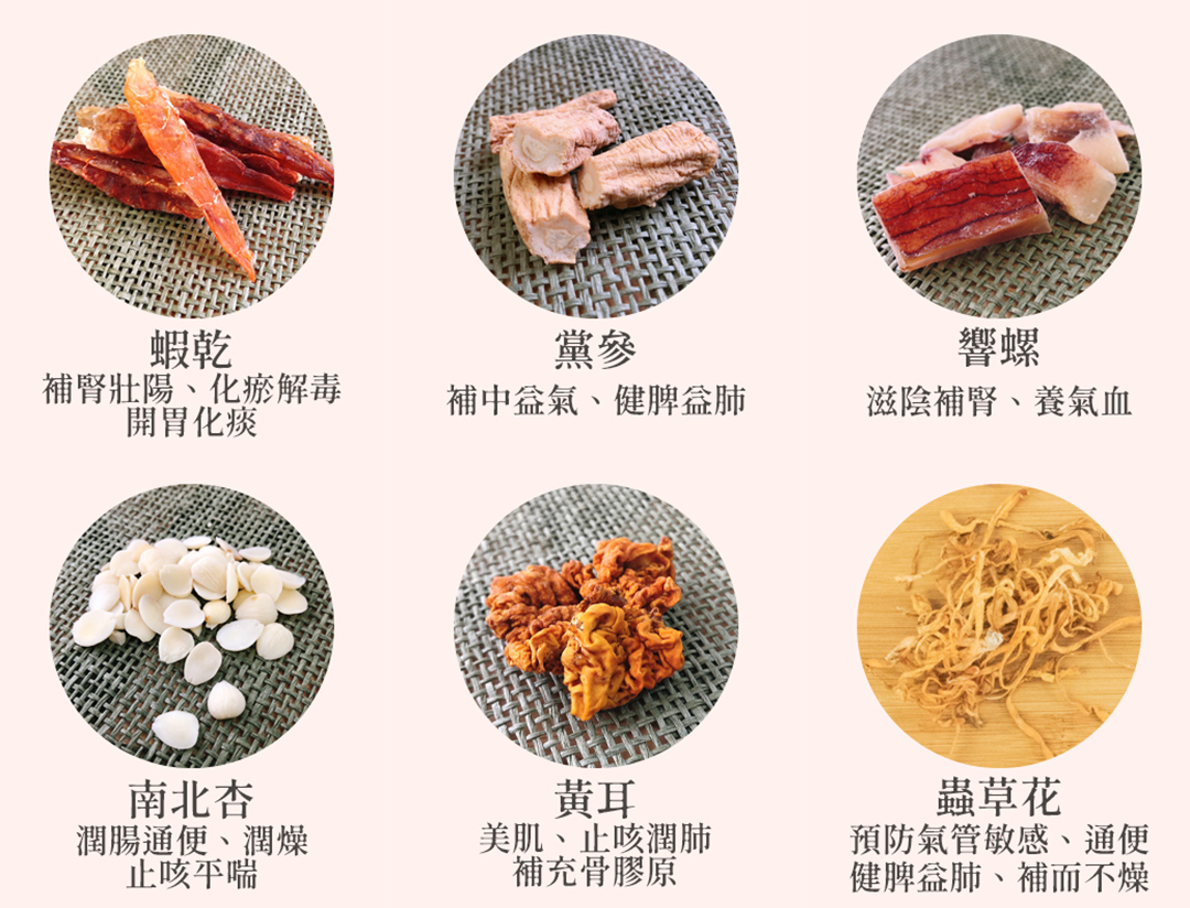 成份:蟲草花、黃耳、黨參、南北杏、螺片、蝦乾