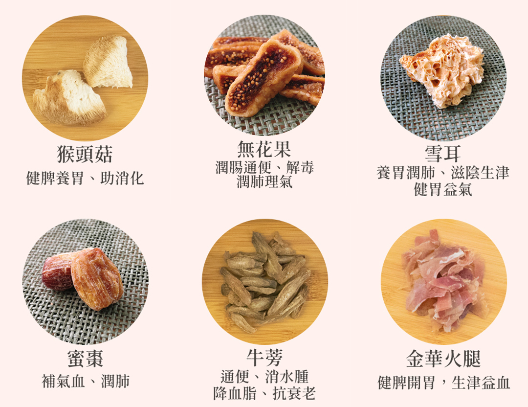 成份:牛蒡、猴頭菇、雪耳、無花果、蜜棗、金華火腿