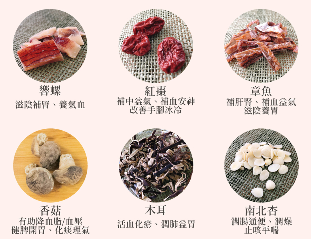 成份:冬菇、白背木耳、螺頭、南北杏、章魚、紅棗