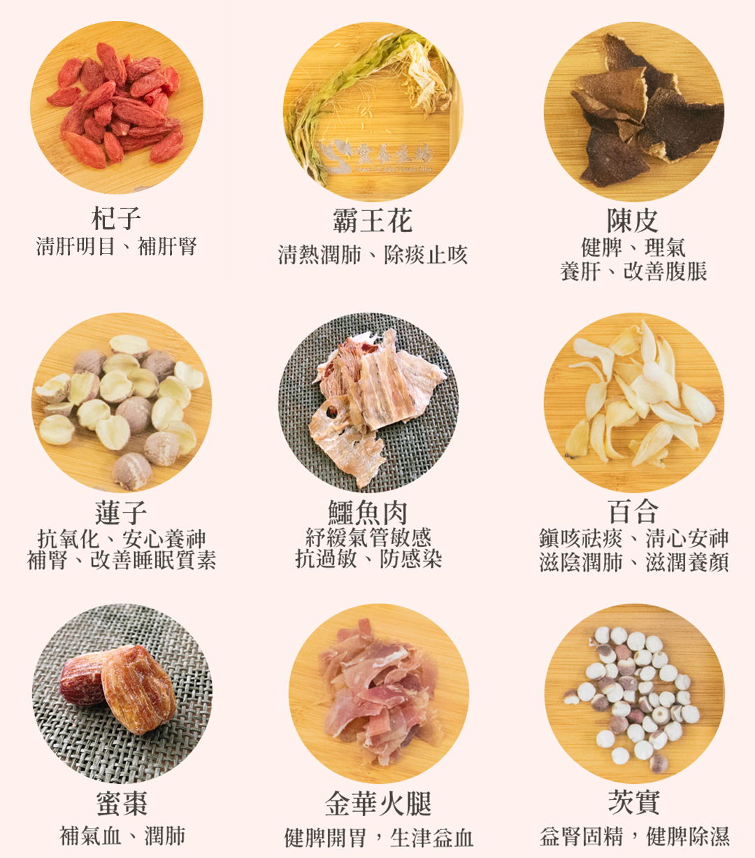 成份:霸王花、鱷魚肉乾、茨實、蜜棗、陳皮、杞子、蓮子、百合、金華火腿