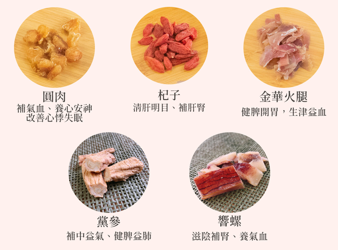成份:黨參、螺片、圓肉、杞子、金華火腿